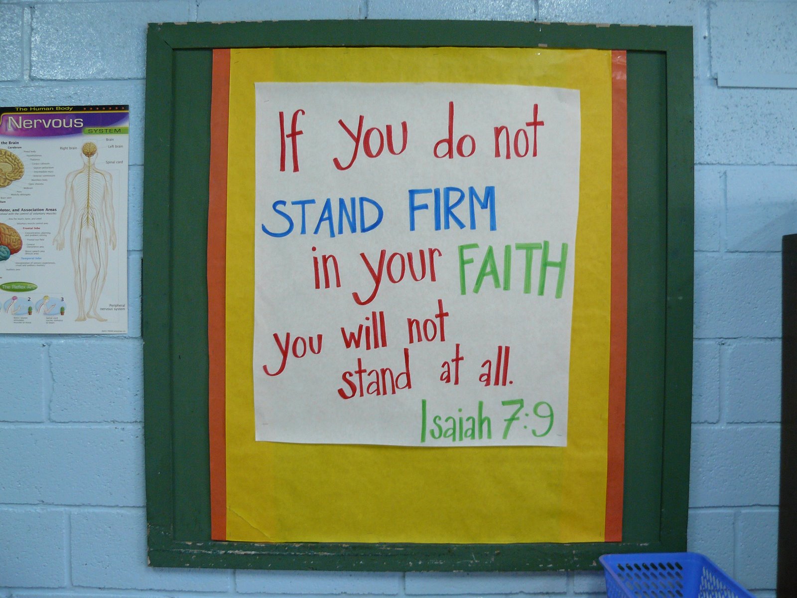I found out a few days before school started that I would be in this particular classroom and because neither the English teacher nor I are full-time teaching, we didn’t have much time to dedicate to decorating. But, as I searched my brain for inspiration, I came up with this verse I first heard at CHALLENGE at Purdue University many years ago. I don’t remember much about the speaker, but I do remember she handed out a half sheet of neon green paper to each student present. Isaiah 7:9 was written in clear, bold script.