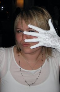 Here’s a pic of Birthday girl Jen- with her painted lace glove! She had a body painter there who painted pearl necklaces, gloves, white tattoos, etc. So cool!