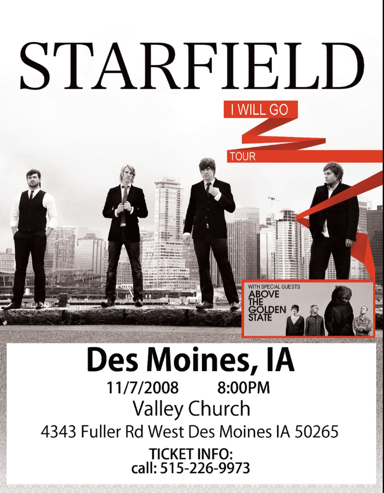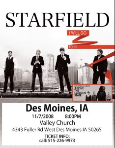 Live in Central Iowa? Like Great Music? Poor? Then you should come to the Starfield concert, Nov. 7th, Valley Church, for only $10. Yep, $10. See you there! Print this off and bring a group!