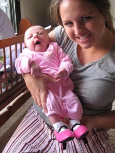 y belated birthday from meg and myla! myla is a little bit like her mommy in that she likes to be fashionably late (well.. 4 days overdue and she still didn’t want to come out..).. so it is only natural that we are late to wish you a HAPPY 24th.. but we LOVE auntie caroline SO much! Myla can’t wait to meet you. she loves her little turtle with your voice message in it and will definitely know you when she meets you in person because of it 🙂 she also wants to teach you a little bit about fashion.. specifically high heels. she may be a shorty like us so she already has heels. i told her about you not brining any heels to honduras with you and how i was trying to convince you that you should have at least ONE pair. maybe you have shopped by now though and gotten some. 🙂 although they probably won’t do you much good when you are doing crazy things like getting lost in the mountains. here is a pic of my in her “Heeliarious” high heels for babies. altough.. (yawn) she doesn’t seems too interested in them. maybe she is more like you than her mama 🙂 just thought you would get a laugh out of this.. a friend ordered them online after seeing them on the Today show and deciding that they were ridiculous but funny. Anyways.. sending love from our little west michigan corner of the world. we miss you around here and can’t wait to spend time at Christmas! lots of LOVE!!!