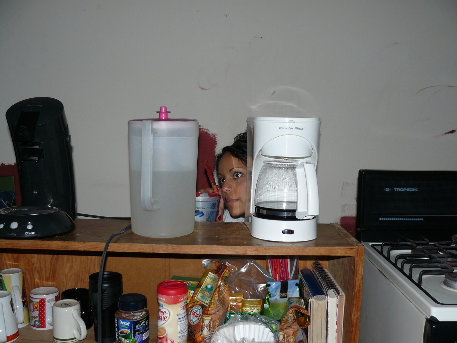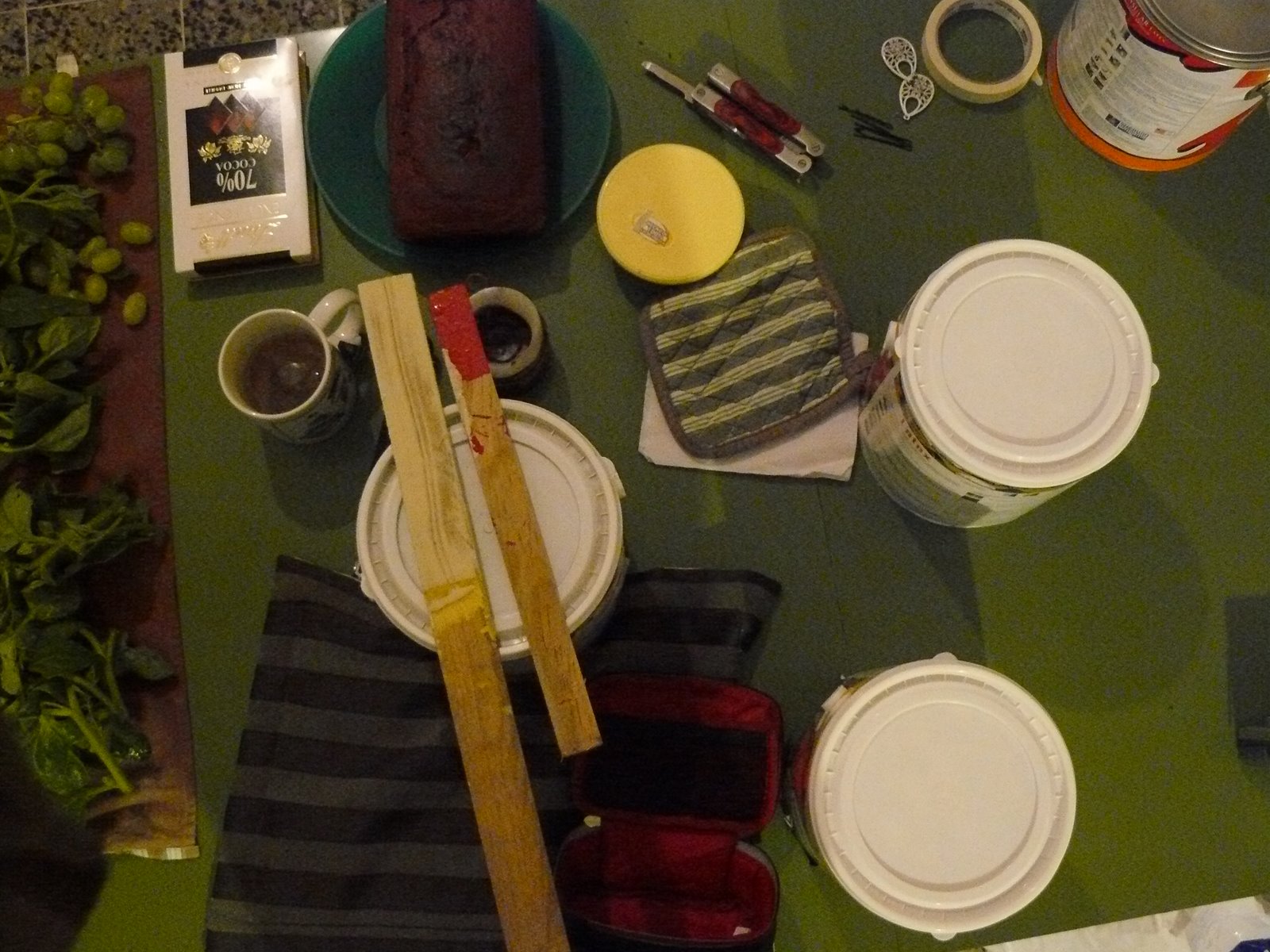 Halfway through our fume-filled evening, I noticed our countertop had accumulated a curious mixture: paint cans, spinach, grapes, 70% cocoa chocolate, half-drunk mug of tea, placemats, potholders, camera case. Also – what you don’t see – fresh pumpkin bread, and several multi-purpose tools.