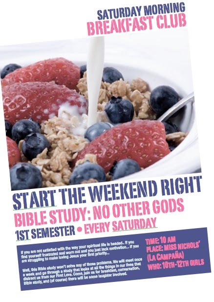 I finally let him leave, but I was almost in tears. I knew almost immediately this was an attack spiritually, because we are really at a tipping point for students. The first spiritual life activities were planned to start this week and they were canceled. It is also just a crucial relationship-building time with students (my first Bible study was to be this week), where we are just getting to the place of trust and confidence and they are making decisions about what this year will look like. Here is a sample of my Bible study poster for 11th grade and the breakfast club Bible study for 10-12th grades.