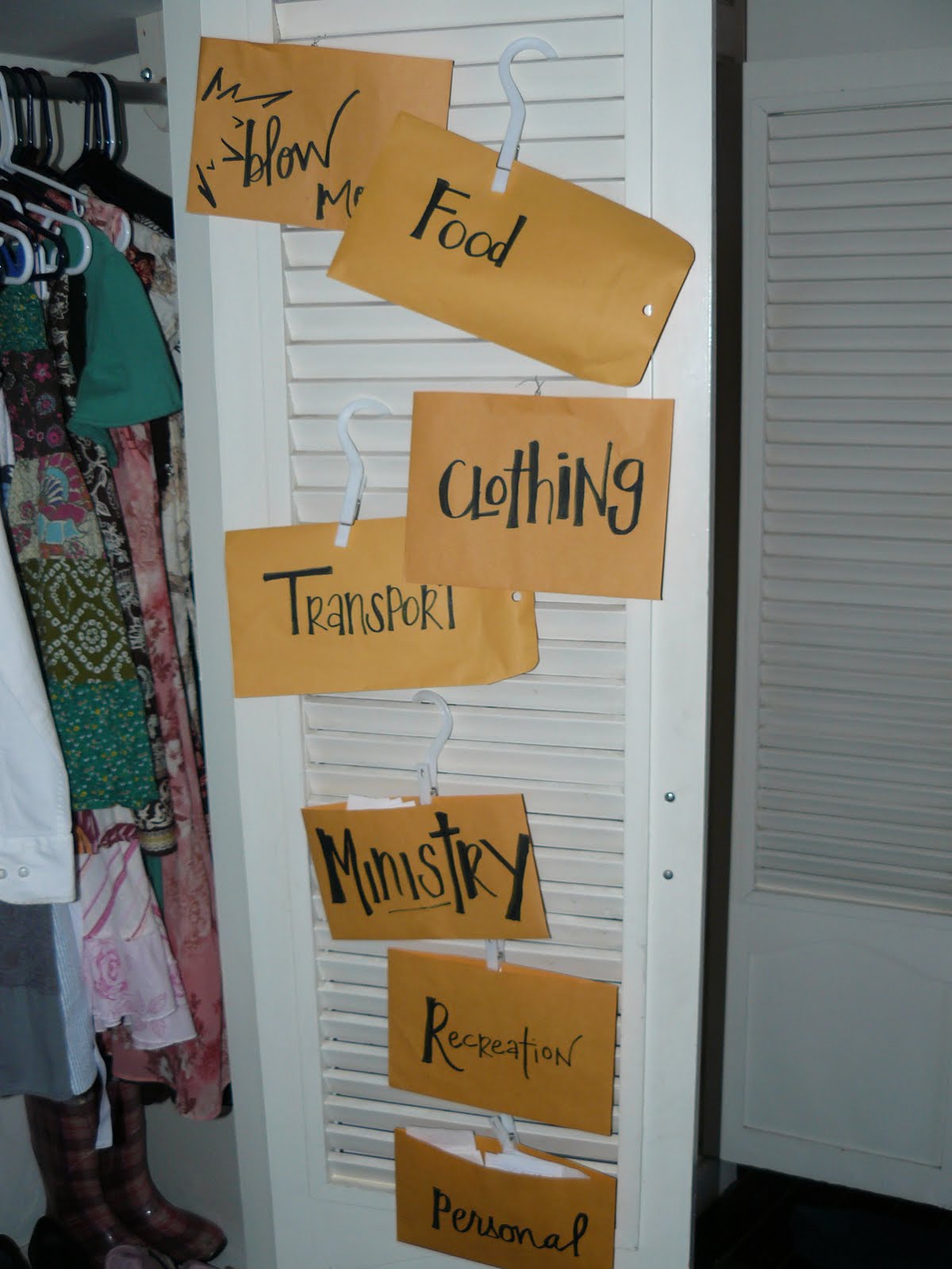So, now I am working on a new system. I planned out what I thought my budget could look like for each month (with the helpful planning materials) and commandeered some very nice looking, large manila envelopes which I made into my organization system in my closet.