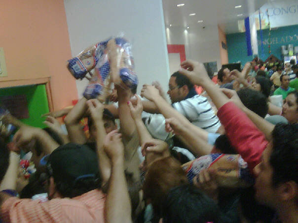 (One of my students took this picture in a local grocery store, where her family had gone to get the necessities for an undetermined amount of time. The store ran out of sugar, eggs, bread, and all the staples and the people were starting to get in a frenzy. When the cart came with bread, the shoppers became out of control and people were crazy to secure a loaf.)