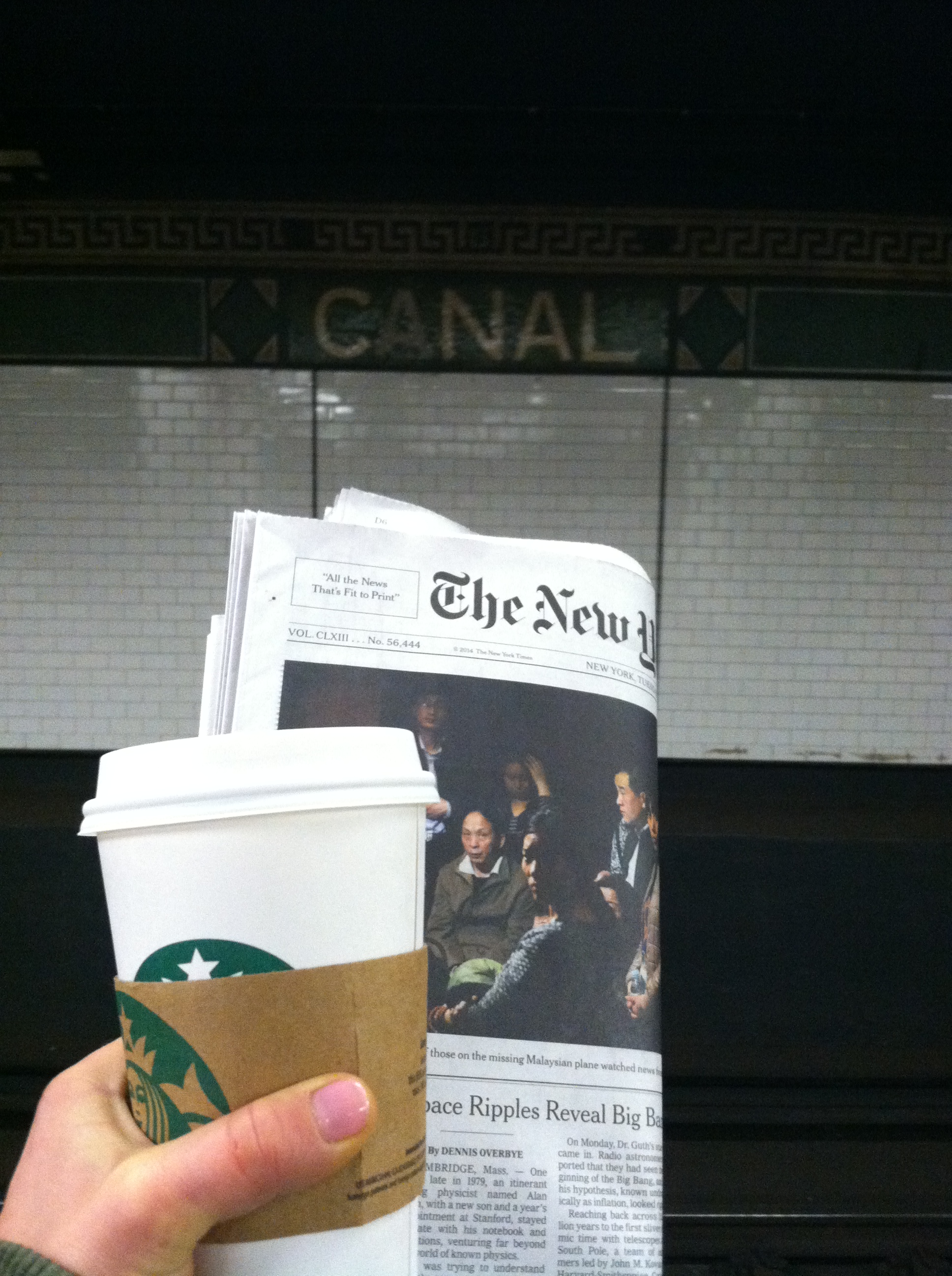 Something about leaving my dentist appointment in Chinatown to wait impatiently for the J train at Canal Street with my large Starbucks and NY Times made me feel especially New York this morning.